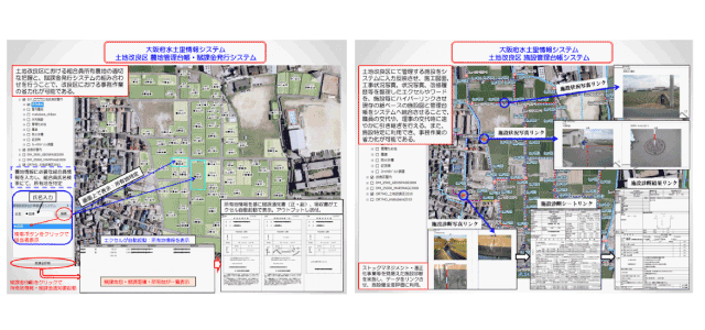 地図情報システム(GIS)を使い、コンピュータ上で航空写真(デジタルオルソ画像)、デジタル地形図を背景図として、農地筆、耕区図(水張り面積)、農業用水利施設図を、それぞれの図(透明なシートをイメージ)を層にして、必要に応じて重ねたり取り替えたりして、目的に応じて表示や加工することができるシステム。