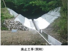 農業用水のため池として、利用される見込みがない場合、決壊による水害等を防止するため、廃止工事により貯水機能を喪失させること、ため池の廃止(廃池)が適当と考えます。 一つの事例として、下の写真のように堤をVカットする堤体開削工法があります。 ![]() |